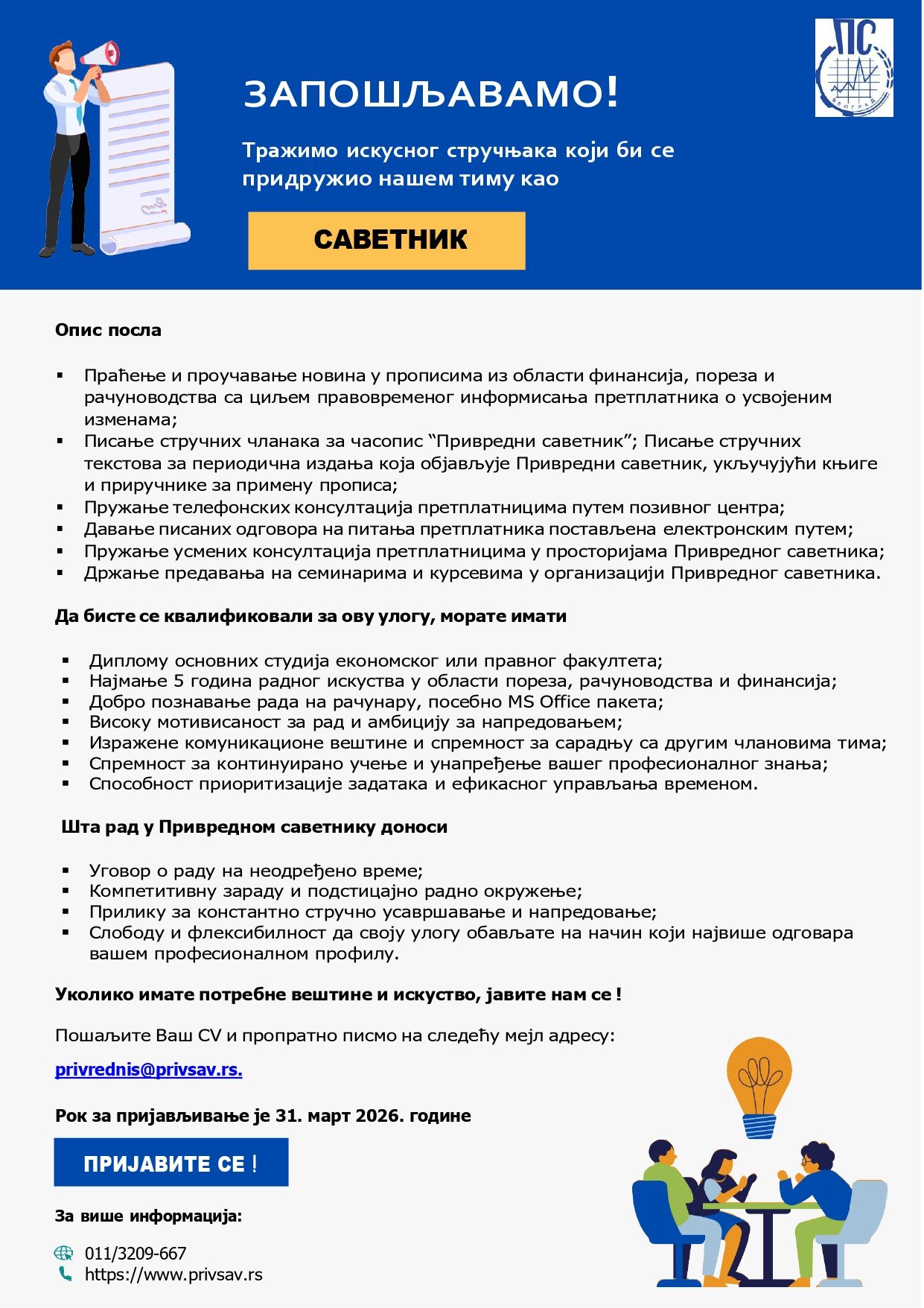 Придружите се нашем тиму – отворен конкурс за радно место: Саветник